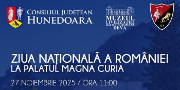 Consiliul Județean Hunedoara, prin Muzeul Civilizației Dacice și Romane Deva și în parteneriat cu Batalionul 53 Geniu „SCORILO”, va marca un moment solemn dedicat Zilei Naționale a României, desfășurat la Palatul Magna Curia. Programul va cuprinde intonarea Imnului Național, intervenții ale reprezentanților instituțiilor județene și ai partenerilor, precum și două alocuțiuni tematice: Căpitan Anca Mureșan – „Ziua Națională a României” Dr. Georgeta Deju – „De pe front, la Alba Iulia” Muzeul Civilizației Dacice și Romane Deva