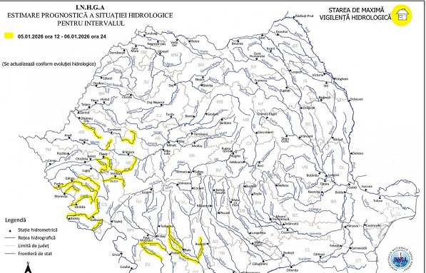 Conform INHGA – Institutul Național de Hidrologie și Gospodărire a Apelor, în perioada 05.01.2026, ora 12:00 – 06.01.2026, ora 24:00, pe afluenții Mureșului aval de confluența cu râul Strei (județele Hunedoara și Arad) se instituie cod galben de inundații.