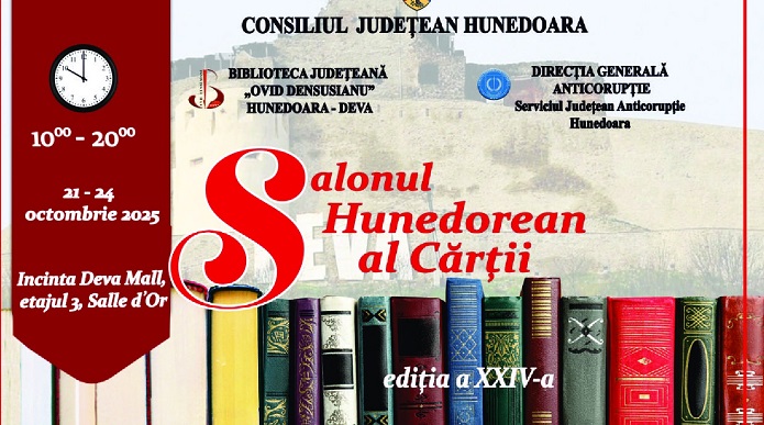 În perioada 21–24 octombrie, în incinta Deva Mall, are loc Salonul Hunedorean al Cărții, organizat de biblioteca noastră cu sprijinul Consiliului Județean Hunedoara. Ne așteaptă zile frumoase alături de cărți, autori și întâlniri de suflet.