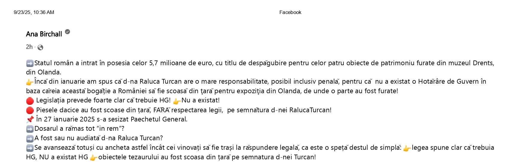 „Statul român a intrat în posesia celor 5,7 milioane de euro, cu titlu de despăgubire pentru celor patru obiecte de patrimoniu furate din muzeul Drents, din Olanda. Încă din ianuarie am spus că d-na Raluca Turcan are o mare responsabilitate, posibil inclusiv penală, pentru că  nu a existat o Hotărâre de Guvern în baza căreia această bogăție a României să fie scoasă din ţară pentru expoziţia din Olanda, de unde o parte au fost furate!