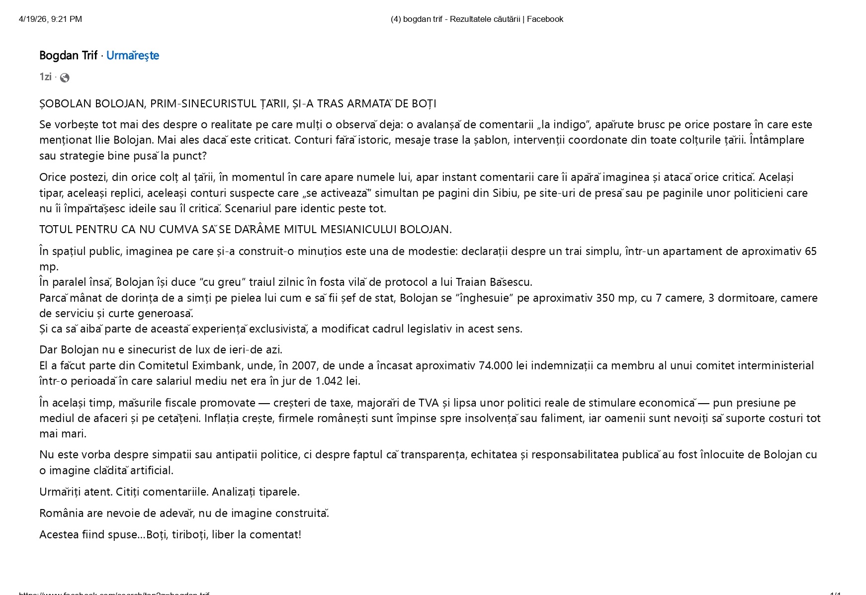 Deputatul Bogdan Trif, liderul PSD Sibiu, susține într-o postare pe Facebook că o „armată de boți” intervine la postările despre premierul liberal, „mai ales dacă este criticat”, cu scopul „ca nu cumva să se dărâme mitul mesianicului Bolojan”. Postarea lui este însoțită de o caricatură în care Bolojan e prezentat drept șobolan.