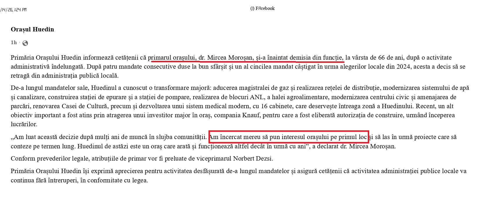 Primarul orașului Huedin, Mircea Moroșan, și-a anunțat demisia, conform unui comunicat de presă al Primăriei Huedin. Liberalul, în vârstă de 66 de ani a decis să se retragă din administrația publică.