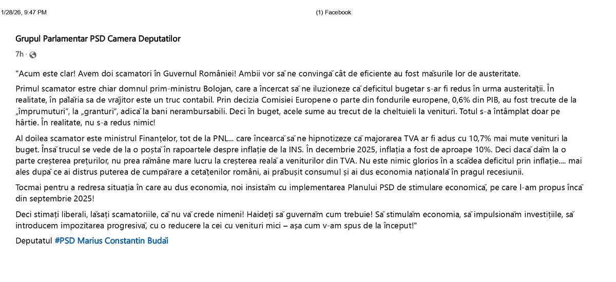 Deputatul PSD, Marius Budăi îi taie elanul premierului Ilie Bolojan care și-a etalat reducerea deficitul bugetar ca pe o victorie obținută în urma măsurilor de austeriate. Budăi spune că datele prezentate de premier nu sunt altceva decât un „truc contabil” realizat cu ajutorul ministrului de Finanțe, Alexandru Nazare. Practic, deputatul social-democrat spune că datele prezentate sunt o minciuni menite să valideze austeritatea impusă de Guvernul Bolojan.