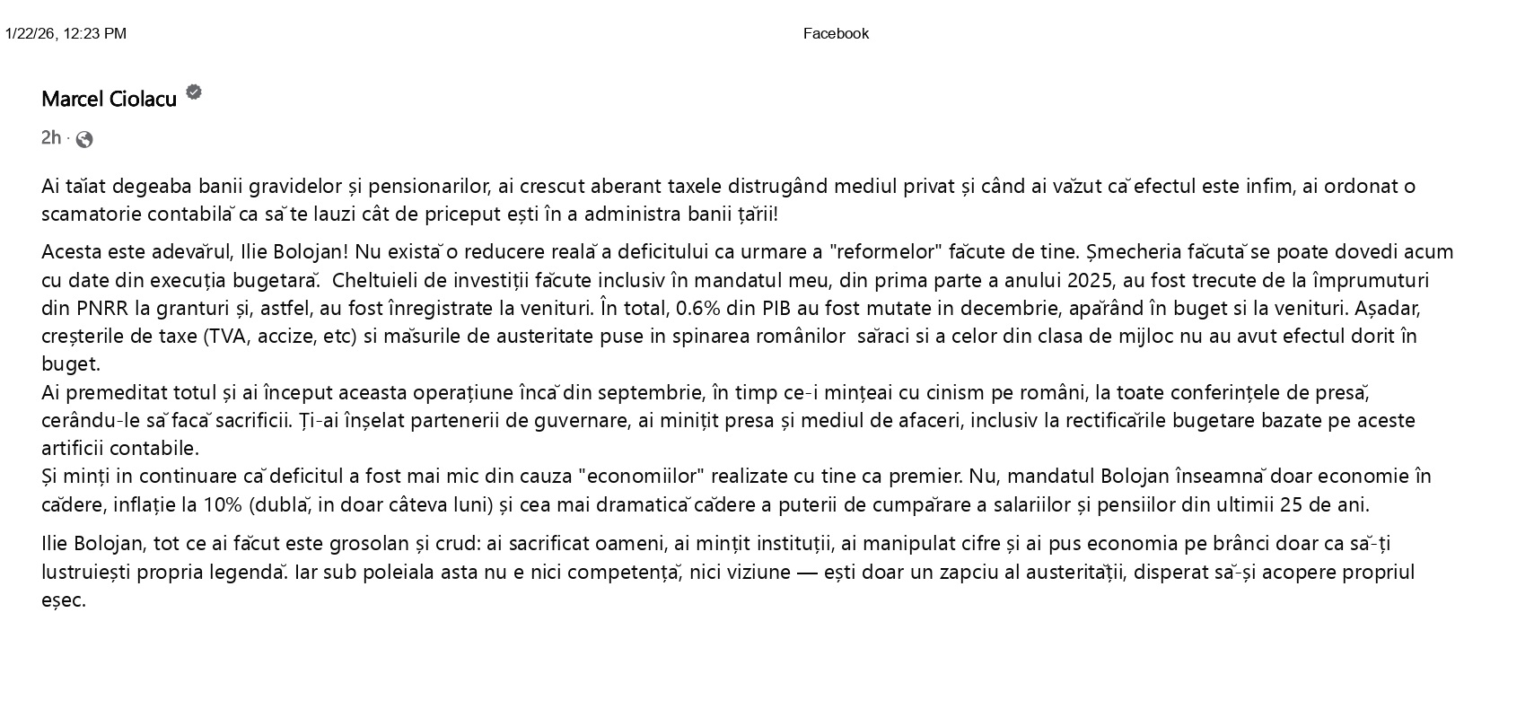 (…) Și minți în continuare că deficitul a fost mai mic din cauza „economiilor” realizate cu tine ca premier. Nu, mandatul Bolojan înseamnă doar economie în cădere, inflație la 10% (dublă, in doar câteva luni) și cea mai dramatică cădere a puterii de cumpărare a salariilor și pensiilor din ultimii 25 de ani.
