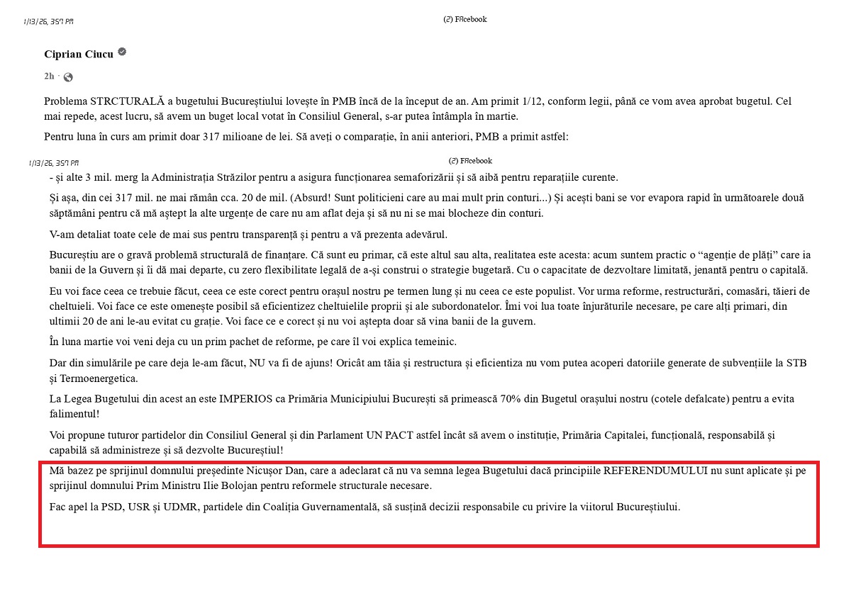 Proaspăt ales primar la Capitală, liberalul Ciucu pare să înțeleagă dezastrul lăsat în urma lui de Nicușor Dan. Într-o postare pe pagina de socializare, Ciprian Ciucu spune că, “PMB nu are bani nici să treacă strada”. Ciucu face un apel la președintele Nicușor Dan și premierul Ilie Bolojan să nu semneze legea Bugetului dacă principiile referendumului votat de bucureșteni nu sunt aplicate.
