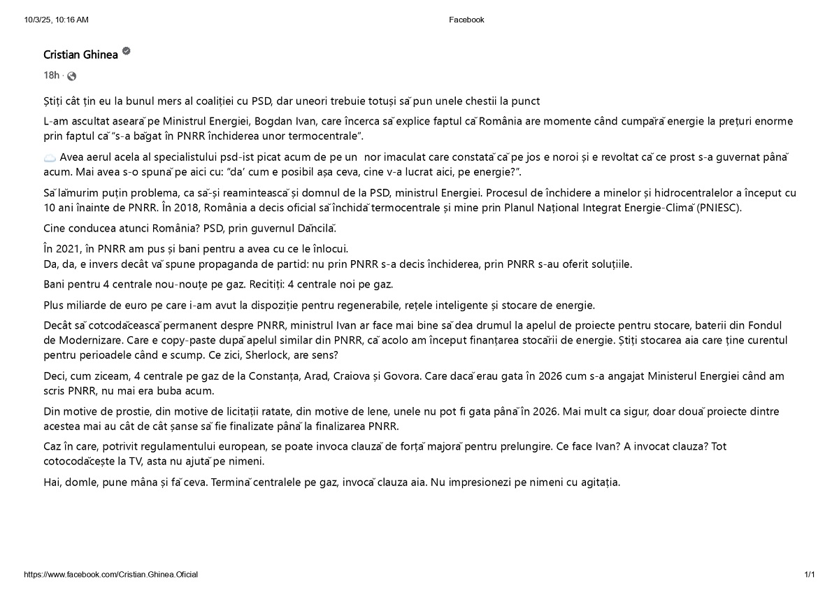 “Să lămurim puțin problema, ca să-și reamintească și domnul de la PSD, ministrul Energiei. Procesul de închidere a minelor și hidrocentralelor a început cu 10 ani înainte de PNRR. În 2018, România a decis oficial să închidă termocentrale și mine, prin Planul Național Integrat Energie-Climă (PNIESC). Cine conducea atunci România? PSD, prin guvernul Dăncilă”, a consemnat pe pagina de socializare, senatorul USR Cristian Ghinea.