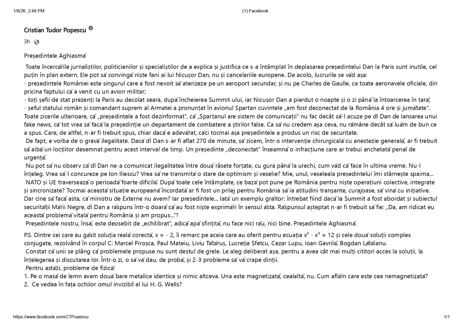CTP-ul spune că toată agitația propagandei de a explica și justifica ce s-a întâmplat pe aeroportul din Franța este inutilă. Jurnalistul îl alintă pe președintele Nicușor cu o nouă etichetă, numindu-l “președintele aghiasmă”, adică „apă sfințită, nu face nici rău, nici bine”.