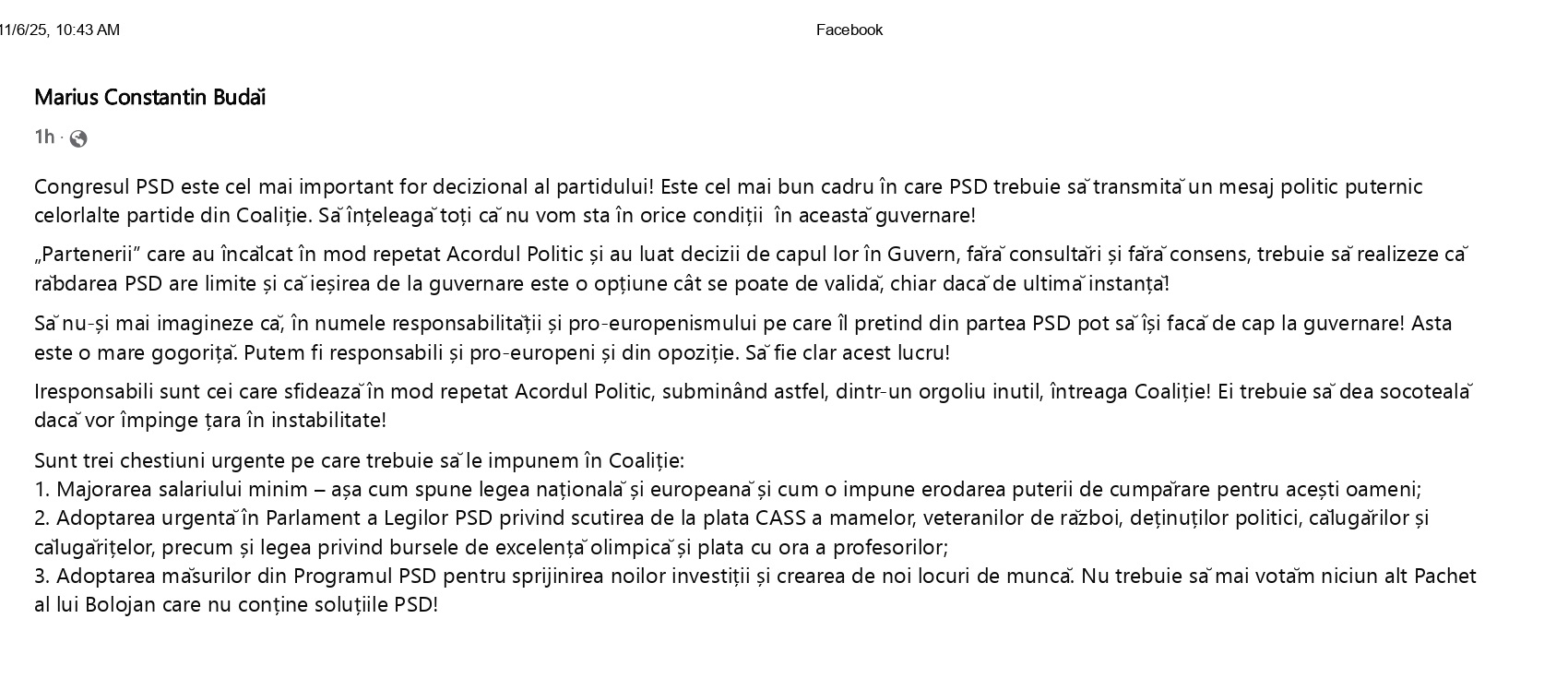 Deputatul PSD, Marius Budăi revine cu noi precizări și preocupări pe tema „alianței cu năbădăi”, PSD-PNL-USR-UDMR. Budăi cere liderilor social-democrați ca după Congresul PSD, partidul să dea un semnal puternic partenerilor de coaliție, care să înțeleagă că PSD-ul nu mai acceptă statutul de “partid nebăgat în seamă”. În caz contrar deputatul spune că PSD-ul poate fi fi responsabil și pro-european și din opoziție.