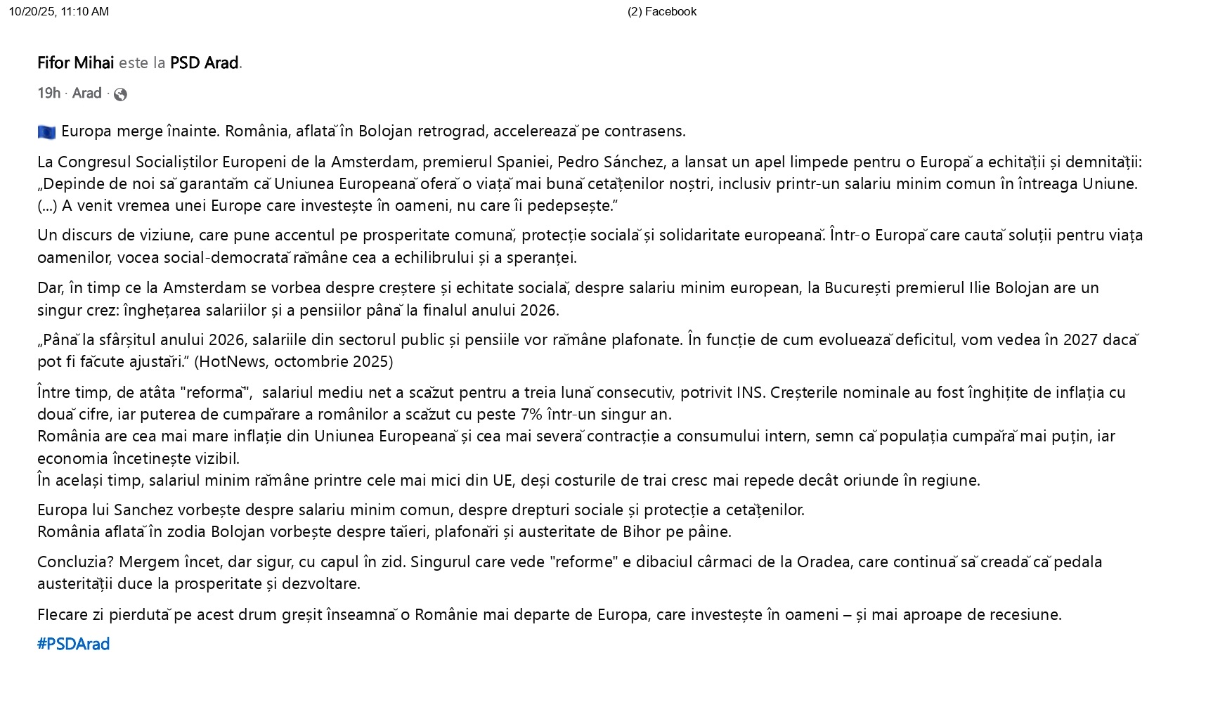 În ultima postare pe pagina de Facebook, Fifor ne anunță că „dibaciul cârmaci de la Oradea” duce țara cu „capul în zid” și contestă măsurile luate de premier. Ca și cum Bolojan este de capul lui în Guvern iar PSD-ul n-a susținut demersurile premierului.