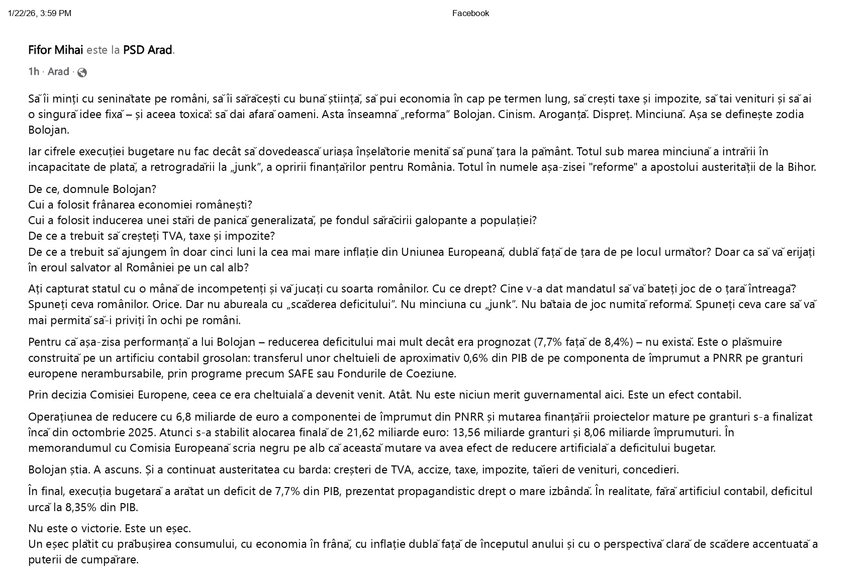 “Ați capturat statul cu o mână de incompetenți și vă jucați cu soarta românilor. Cu ce drept? Cine v-a dat mandatul să vă bateți joc de o țară întreagă? Spuneți ceva românilor. Orice. Dar nu abureala cu „scăderea deficitului”. Nu minciuna cu „junk”. Nu bătaia de joc numită reformă. Spuneți ceva care să vă mai permită să-i priviți în ochi pe români”, a concluzionat Fifor.