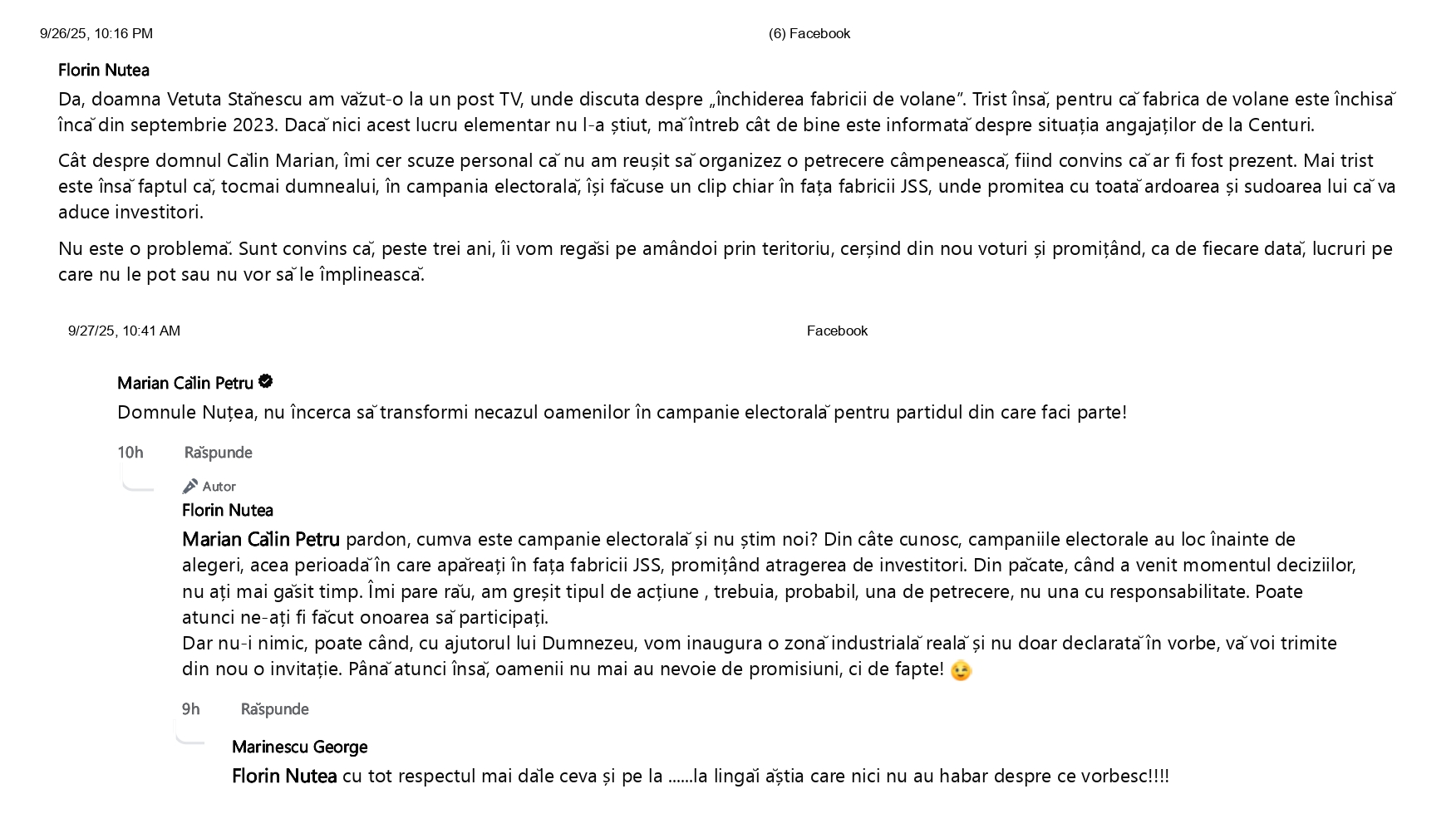 „Îmi cer scuze personal că nu am organizat o petrecere câmpenească. Sunt convins că ar fi fost prezent și el( Călin Marian, n.r). Trist este faptul că tocmai dumnealui în campania electorală își făcuse un clip video chiar în fața fabricii JSS, unde promitea cu toată ardoarea și sudoarea lui că va aduce investitori”, a punctat Florin Nuțea pe pagina de socializare.