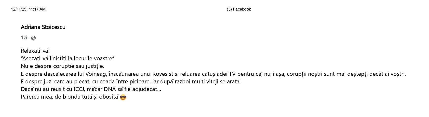 Părerea mea, de blondă tută și obosită”, scrie Stoicescu pe Facebook.