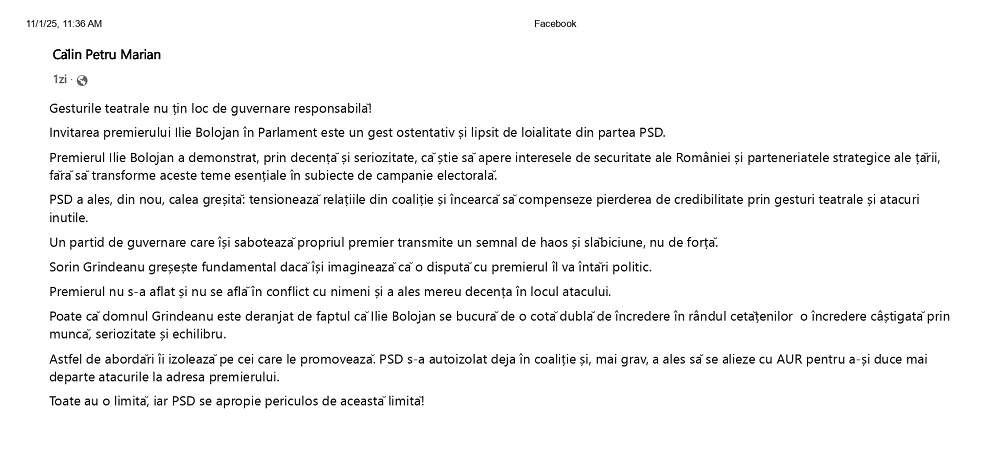 (…) PSD a ales, din nou, calea greșită: tensionează relațiile din coaliție și încearcă să compenseze pierderea de credibilitate prin gesturi teatrale și atacuri inutile. Un partid de guvernare care își sabotează propriul premier transmite un semnal de haos și slăbiciune, nu de forță”, a precizat senatorul Călin Marian.