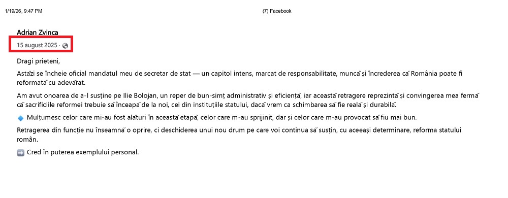 “Astăzi se încheie oficial mandatul meu de secretar de stat — un capitol intens, marcat de responsabilitate, muncă și încrederea că România poate fi reformată cu adevărat.