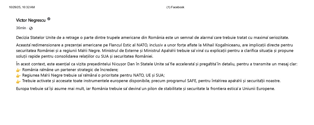 „Această redimensionare a prezenței americane pe Flancul Estic al NATO, inclusiv a unor forțe aflate la Mihail Kogălniceanu, are implicații directe pentru securitatea României și a regiunii Mării Negre.