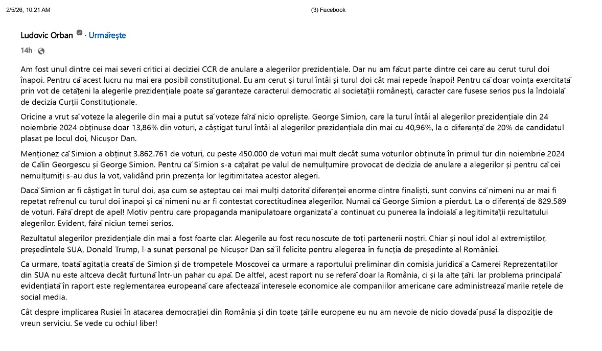 Raportul comisiei juridice a Camerei Reprezentaților din SUA cu privire la anularea alegerilor din România, l-a făcut pe fostul consilier prezidențial, Ludovic Orban să reacționeze. Într-o postare pe pagina de socilaizare, Orban spune că desi a criticar decizia CCR de anulare a alegerilor, în luna mai 2025, alegerile prezidențiale s-au desfășurat corect iar Nicușor Dan a câștigat și a fost felicitat de Donlad Trump.