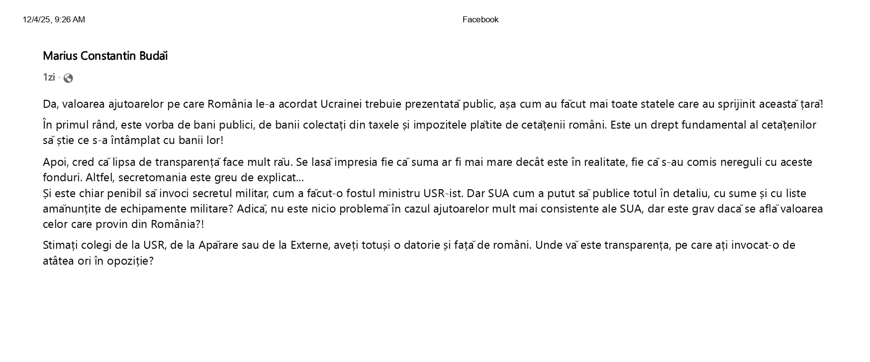 (…) Și este chiar penibil să invoci secretul militar, cum a făcut-o fostul ministru USR-ist. Dar SUA cum a putut să publice totul în detaliu, cu sume și cu liste amănunțite de echipamente militare? Adică, nu este nicio problemă în cazul ajutoarelor mult mai consistente ale SUA, dar este grav dacă se află valoarea celor care provin din România?!