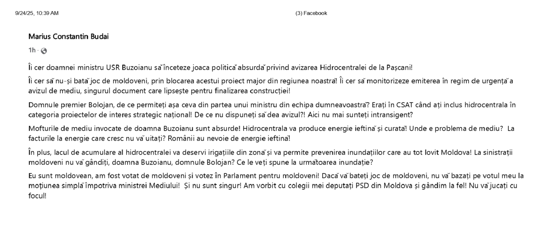 Deputatul PSD, Marius Budăi îi atrage atenția ministrului Mediului, Diana Buzoianu că votul său la moțiunea simplă depusă de AUR va depinde de modul în care îi tratează pe moldoveni. Deputatul spune că nu-i va trăda pe cei care l-au votat în Parlamentul României, iar în cazul în care Buzoianu va refuza să semneze avizul de mediu pentru Hidrocentrala Pașcani atunci va vota moțiunea simplă depusă de AUR.