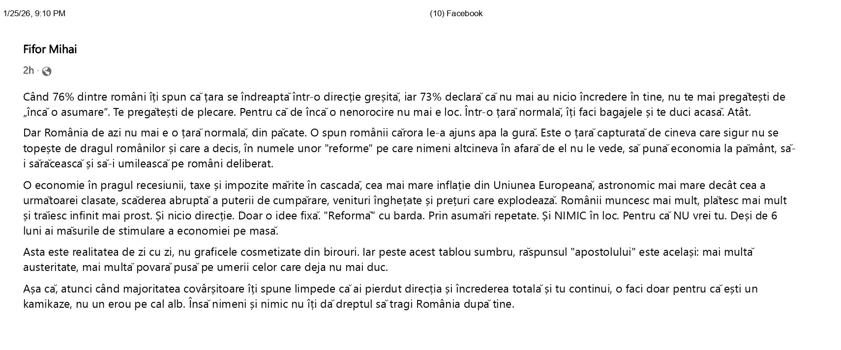 “Când 76 la sută dintre români îți spun că țara se îndreaptă într-o direcție greșită, iar 73 la sută declară că nu mai au nicio încredere în tine, nu te mai pregătești de „încă o asumare”. Te pregătești de plecare. Pentru că de încă o nenorocire nu mai e loc. Într-o țară normală, îți faci bagajele și te duci acasă. Atât”, i-a transmis Fifor premierului Ilie Bolojan