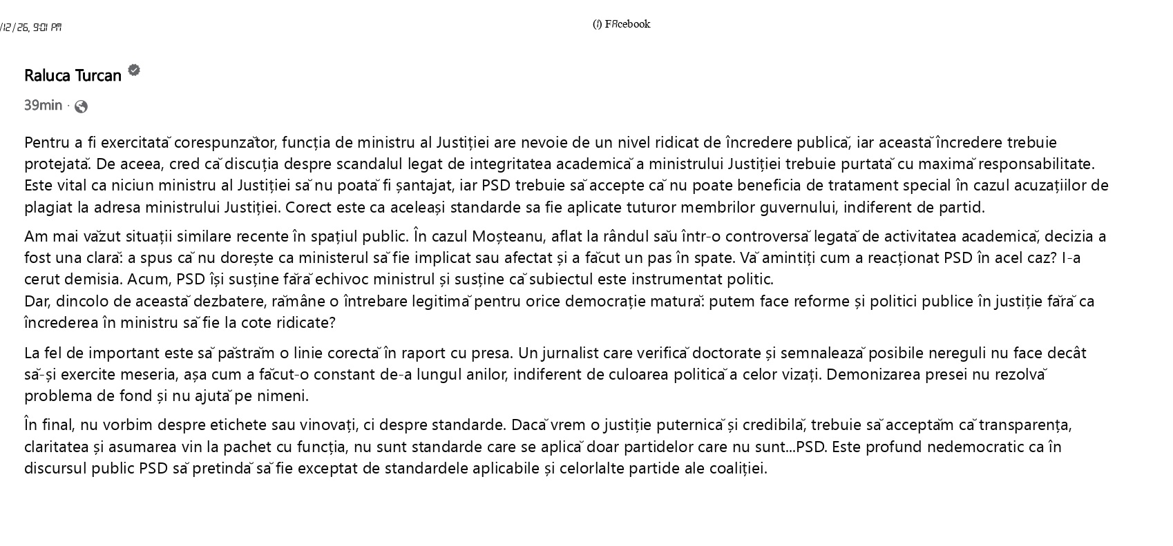 La fel de evidentă este și afirmația Turcanei: “Dacă vrem o justiție puternică și credibilă, trebuie să acceptăm că transparența, claritatea și asumarea vin la pachet cu funcția”