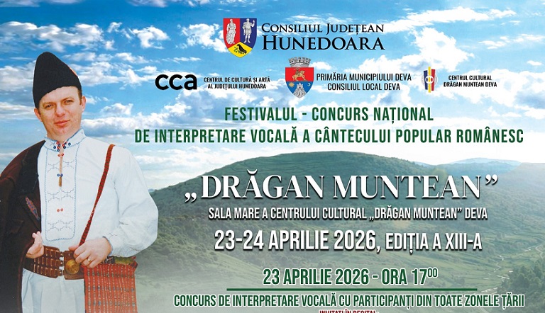 Primăria Municipiului Deva anunță organizarea, în perioada 23–24 aprilie 2026, a celei de-a XIII-a ediții a Festivalului-Concurs Național de Interpretare Vocală a Cântecului Popular Românesc „Drăgan Muntean”, un eveniment de prestigiu dedicat valorilor autentice ale folclorului românesc și memoriei marelui interpret Drăgan Muntean.