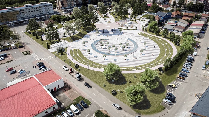 Fântână arteziană decorativă cu suprafață de 324,12 mp, compusă dintr-un bazin central și 7 fântâni satelit, totalizând 42 de jeturi de apă, placată cu oțel COR-TEN, iluminare LED RGB, recirculare automată a apei cu filtrare, senzori de temperatură și golire automată în caz de îngheț;