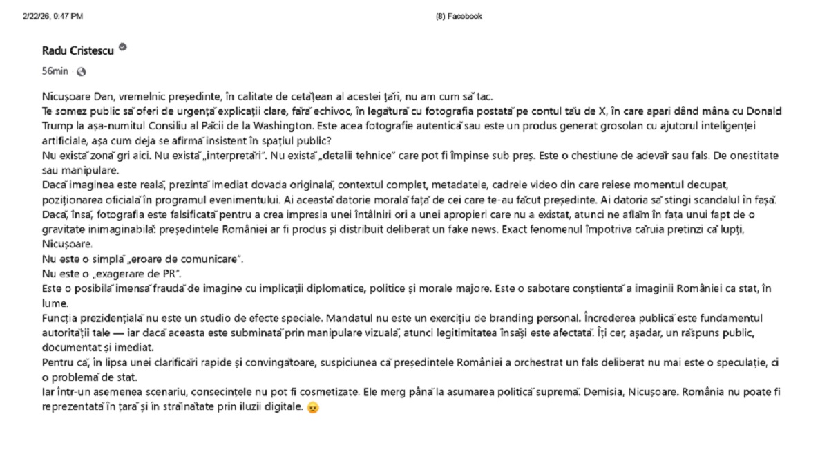 Te somez public să oferi de urgență explicații clare, fără echivoc, în legătură cu fotografia postată pe contul tău de X, în care apari dând mâna cu Donald Trump la așa-numitul Consiliu al Păcii de la Washington. Este acea fotografie autentică sau este un produs generat grosolan cu ajutorul inteligenței artificiale, așa cum deja se afirmă insistent în spațiul public?