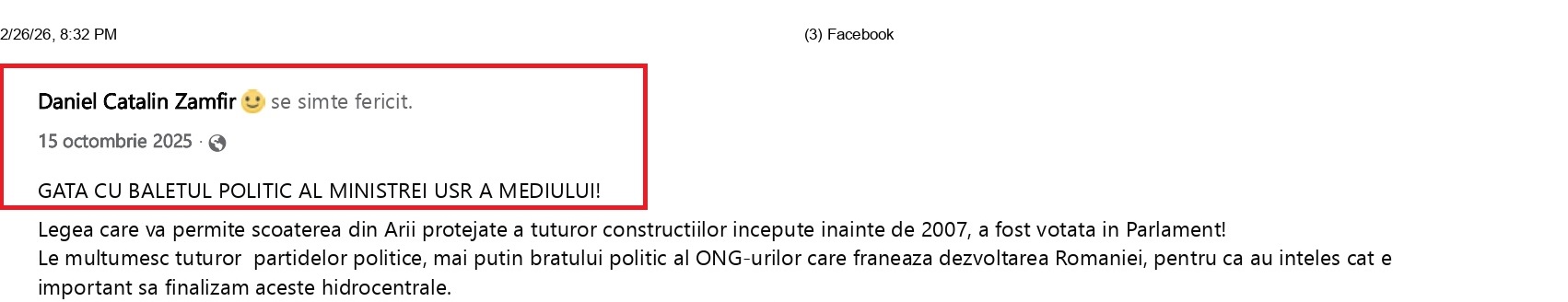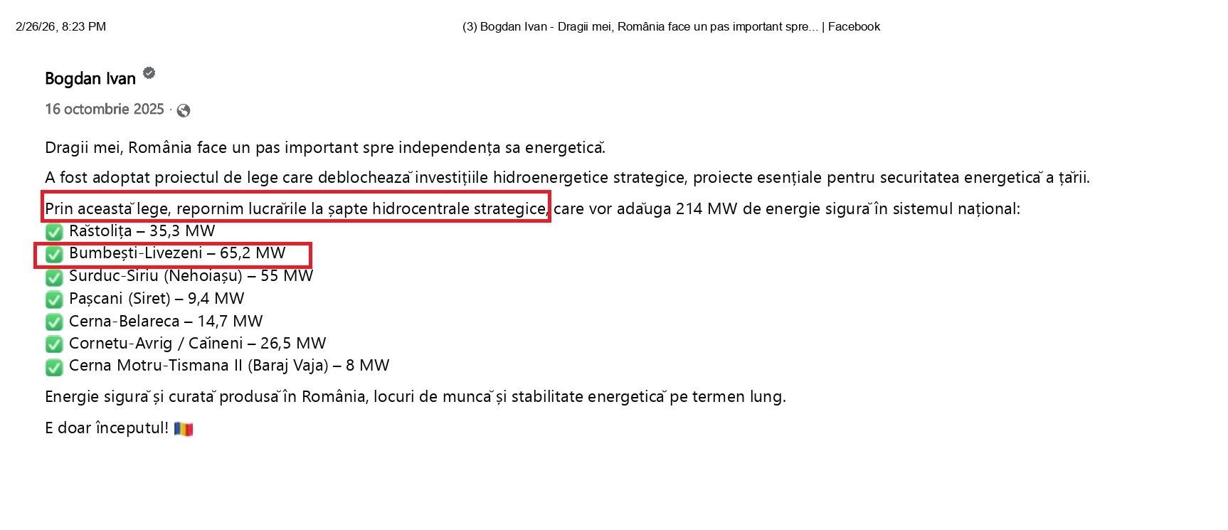 În data de 16 octombrie 2025, atât Bogdan Ivan, ministrul Energiei cât și Daniel Zamfir, liderul senatorilor PSD, anunțau o mare victorie împotriva ONG-urilor de mediu. Construcțiile hidrocentralelor aflate în diferite faze de finalizare începeau să „zbârnie”, iar brațul lung al ONG-urilor era frânt de senatorul Daniel Zamfir. Se felicitau între ei și anunțau că legea care permitea finalizarea acestor hidrocentrale a fost adoptată și astfel treaba a fost rezolvată.