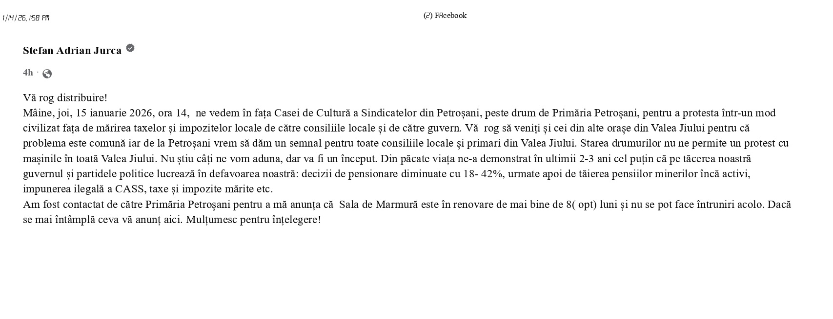 Adrian Jurca le propune locuitorilor Văii Jiului să participe la un protest care va avea loc mâine, 15 ianuarie, în fașa Casei de Cultură a Sindicatelor din Petroșani. Jurca speră ca în acest fel va fi transmis un semnal către primarii și consilierii locali din Valea Jiului, pentru a înțelege că majorarea taxelor și impozitelor locale nu este agreată de cetățeni.
