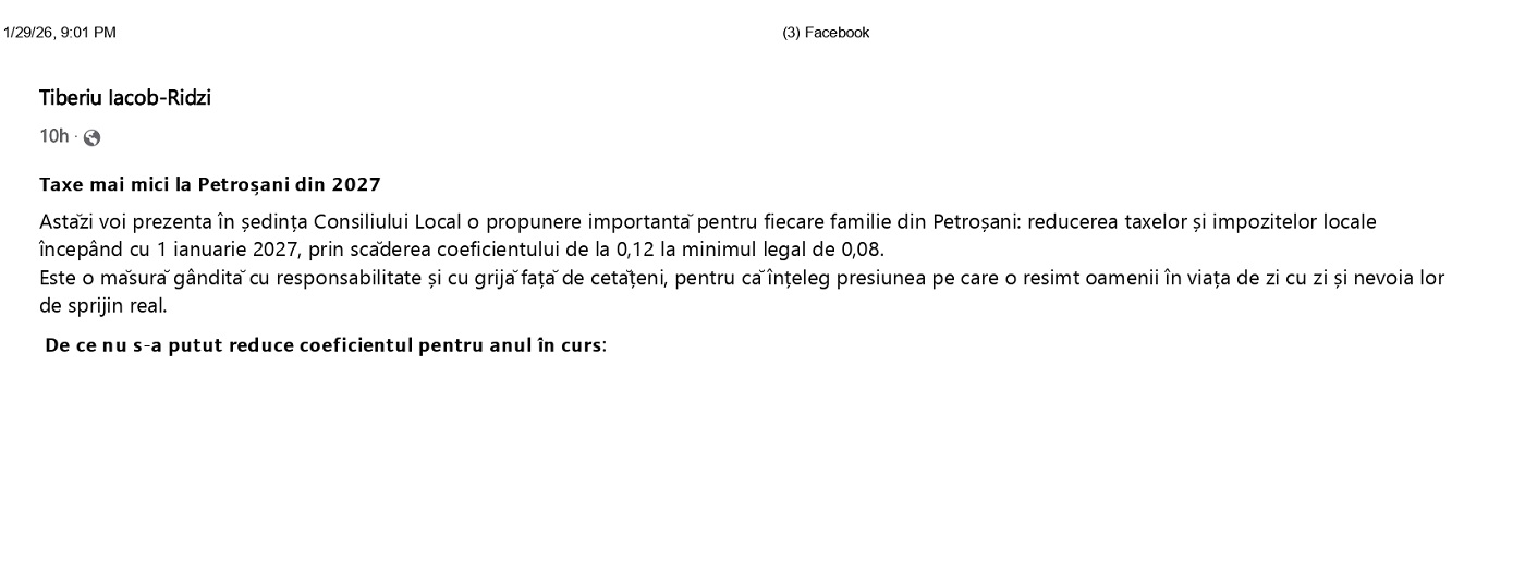 ” Astăzi voi prezenta în ședința Consiliului Local o propunere importantă pentru fiecare familie din Petroșani: reducerea taxelor și impozitelor locale începând cu 1 ianuarie 2027, prin scăderea coeficientului de la 0,12 la minimul legal de 0,08.