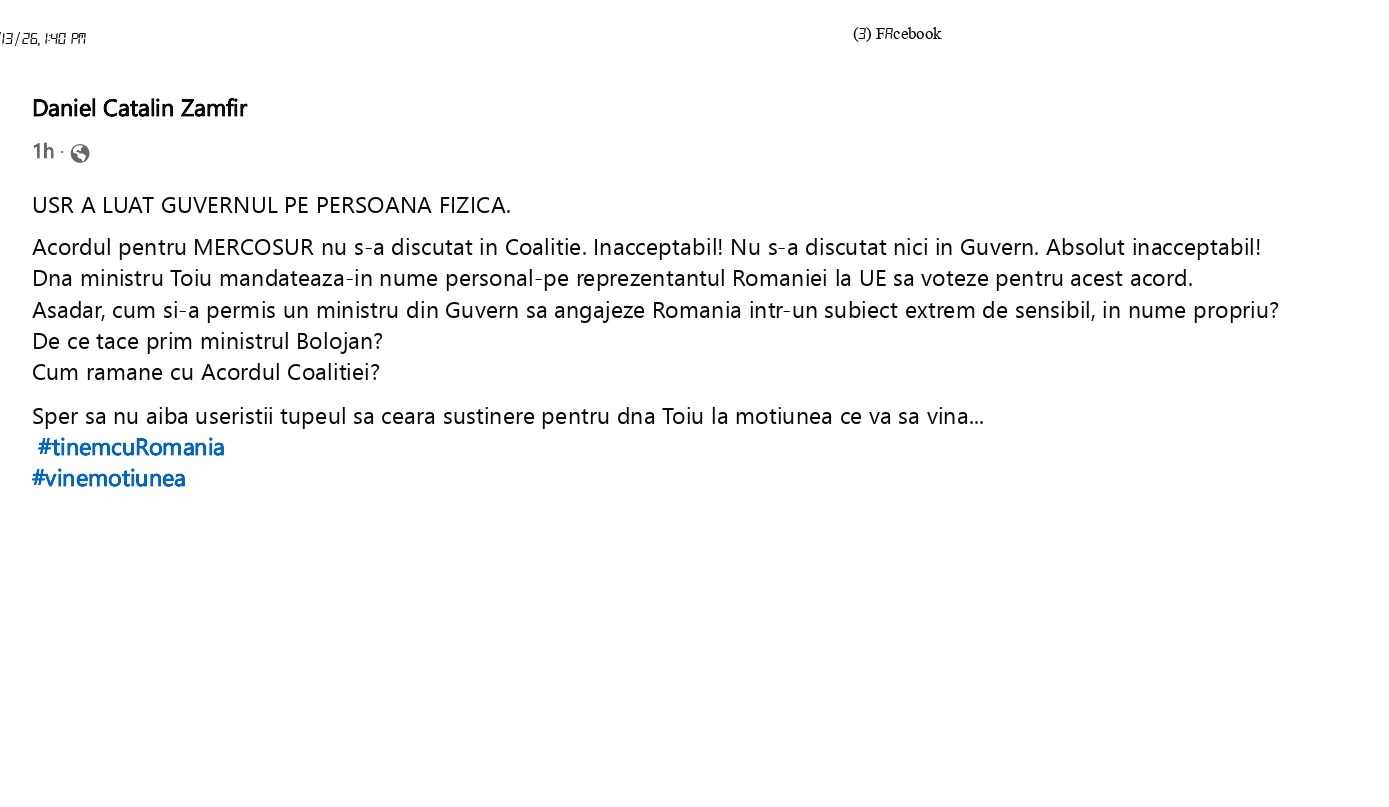 Liderul senatorilor PSD, Daniel Zamfir pare să-și fi revenit după petrecerea de Sfântul Ion. Senatorul se întreabă de ce tace Bolojan în toată povestea cu acordul Mercusor și o acuză pe Oana Țoiu că a angajat România în nume propriu să voteze acest acord.Social-democratul dă de înțeles că așteaptă moțiunea simplă împotriva ministrului de Externe să o poată vota cu ambele mâini. ”Sper să nu aibă useriștii tupeul să ceară susținere pentru doamna Țoiu la motiunea ce va să vină”, a transmis Zamfir pe pagina de socializare.
