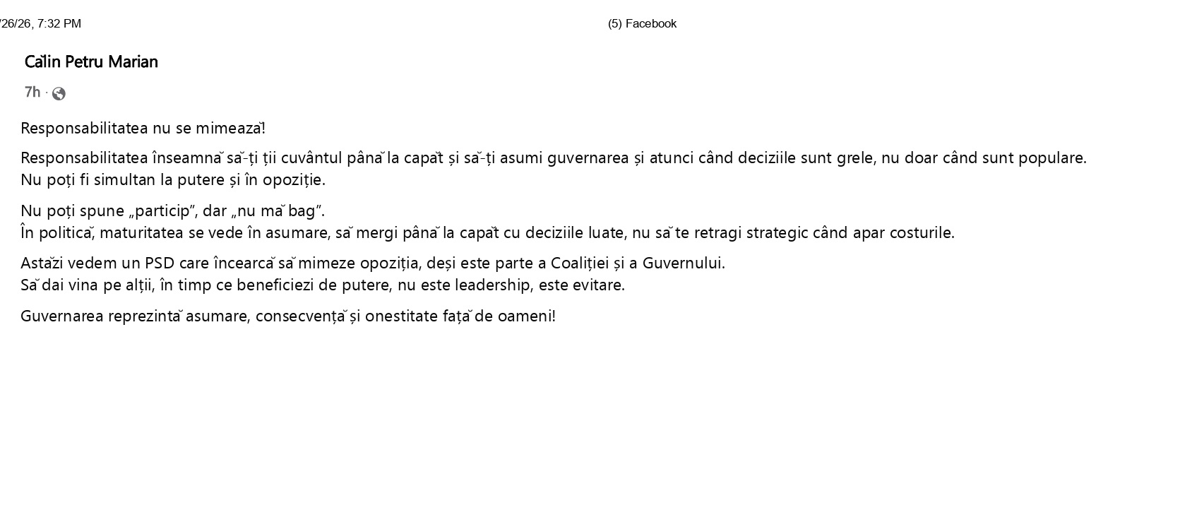 „Responsabilitatea înseamnă să-ți ții cuvântul până la capăt și să-ți asumi guvernarea și atunci când deciziile sunt grele, nu doar când sunt populare. Nu poți fi simultan la putere și în opoziție. Nu poți spune particip, dar nu mă bag. În politică, maturitatea se vede în asumare, să mergi până la capăt cu deciziile luate, nu să te retragi strategic când apar costurile”, le-a transmis senatorul pe pagina de socializare.