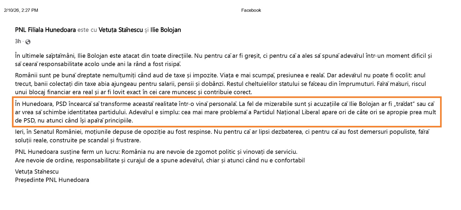 (…) “În Hunedoara, PSD încearcă să transforme această realitate într-o vină personală. La fel de mizerabile sunt și acuzațiile că Ilie Bolojan ar fi „trădat” sau că ar vrea să schimbe identitatea partidului. Adevărul e simplu: cea mai mare problemă a Partidul Național Liberal apare ori de câte ori se apropie prea mult de PSD, nu atunci când își apără principiile.