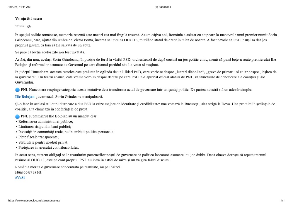 PNL Hunedoara respinge categoric aceste tentative de a transforma actul de guvernare într-un șantaj politic. De partea noastră stă un adevăr simplu: Ilie Bolojan guvernează. Sorin Grindeanu manipulează”, a concluzionat liderul PNL Hunedoara.