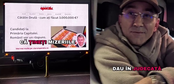Cătălin Drulă, candidat USR la Primăria Capitalei a oprit mașina unei publicații pe care erau afișate informații despre averea de peste 2,5 milioane de dolari. O informație conformă cu declarația de avere a acestuia. Drulă i-a luat la întrebări pe șoferi, cărora le-a adresat cuvinte dure și i-a amenințat că îi va da în judecată.